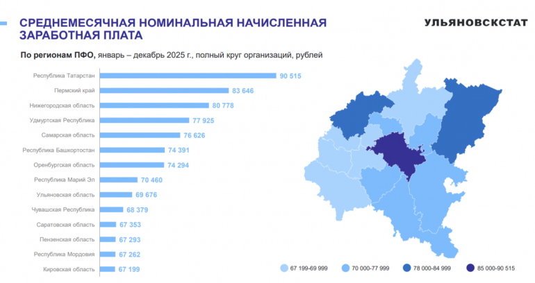 По данным Ульяновскстата, в январе текущего года средняя зарплата в Ульяновской области составляла 69 676 рублей. По этому показателю регион занял 9-е место в ПФО. Возглавляет рейтинг Республика Татарстан (90 515 рублей).