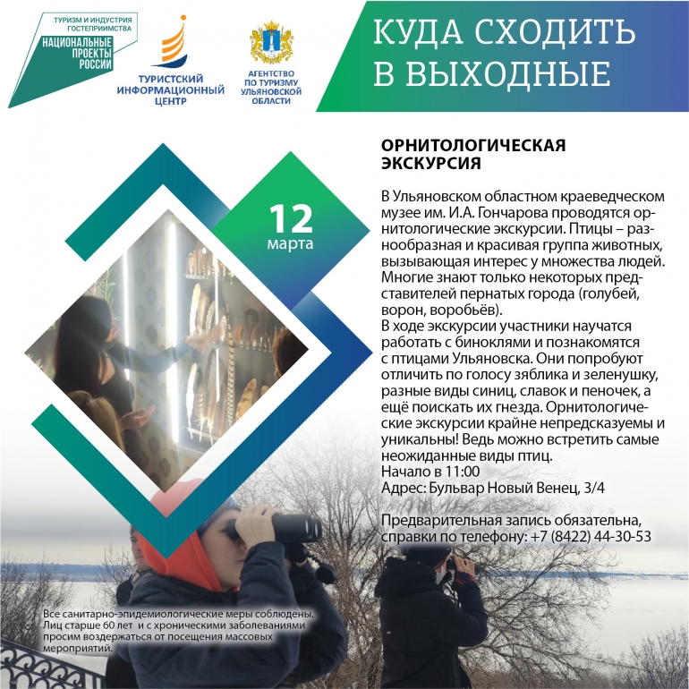 В ходе экскурсии участники научатся работать с биноклями и познакомятся с птицами Ульяновска. Попробуют отличить по голосу зяблика и зеленушку, разные виды синиц, славок и пеночек, а ещё поискать их гнезда. Орнитологические экскурсии крайне непредсказуемы и уникальны! Ведь можно встретить самые неожиданные виды птиц.