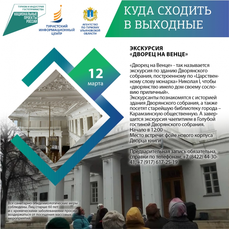Экскурсанты познакомятся с историей здания Дворянского собрания, а также посетят старейшую библиотеку города – Карамзинскую общественную. А завершится экскурсия чаепитием в Голубой гостиной Дворянского собрания.