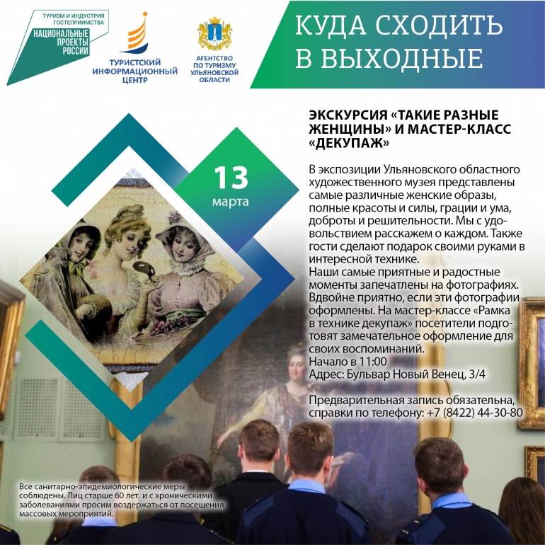 Экскурсия «Такие разные женщины» и мастер-класс «Декупаж». Начало в 11:00. Адрес: Бульвар Новый Венец, 3/4.