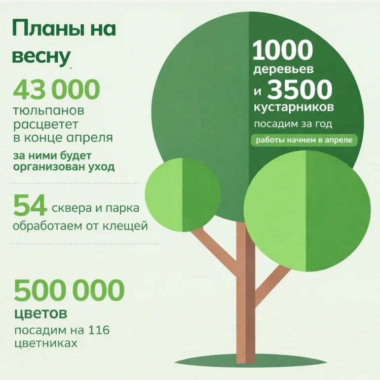 - 500 000 цветов посадим на 116 цветниках, 43 000 тюльпанов расцветет в конце апреля, за ними будет организован уход, - рассказали в Горзеленхозе.