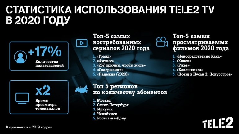 Tele2 проанализировала активность абонентов в приложении Tele2 TV в 2020 году. Количество пользователей сервиса увеличилось на 17%. По сравнению с 2019 годом в два раза больше времени зрители уделяли просмотру ТВ-каналов в приложении. Самыми просматриваемыми стали комедии «Холоп» и «Непосредственно Каха», а также сериал «Гранд».