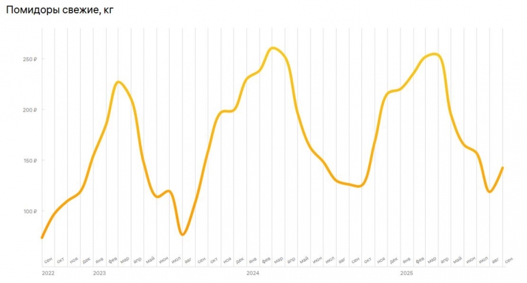На графике Fincult.info (ресурс Центрального банка России) хорошо видно, что резкое повышение цен на помидоры к концу октября носит сезонный характер. Судя по тенденции, максимума цены на этот овощ достигают к весне.