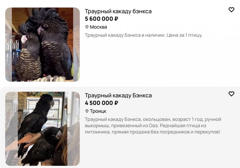 Птицу категорически запрещено вывозить из Австралии на продажу — только для обмена между зоопарками. А так как после начала СВО российские зоопарки попали под санкции, то ввезти траурного какаду Бэнкса в нашу страну законным путем в настоящий момент путем невозможно.