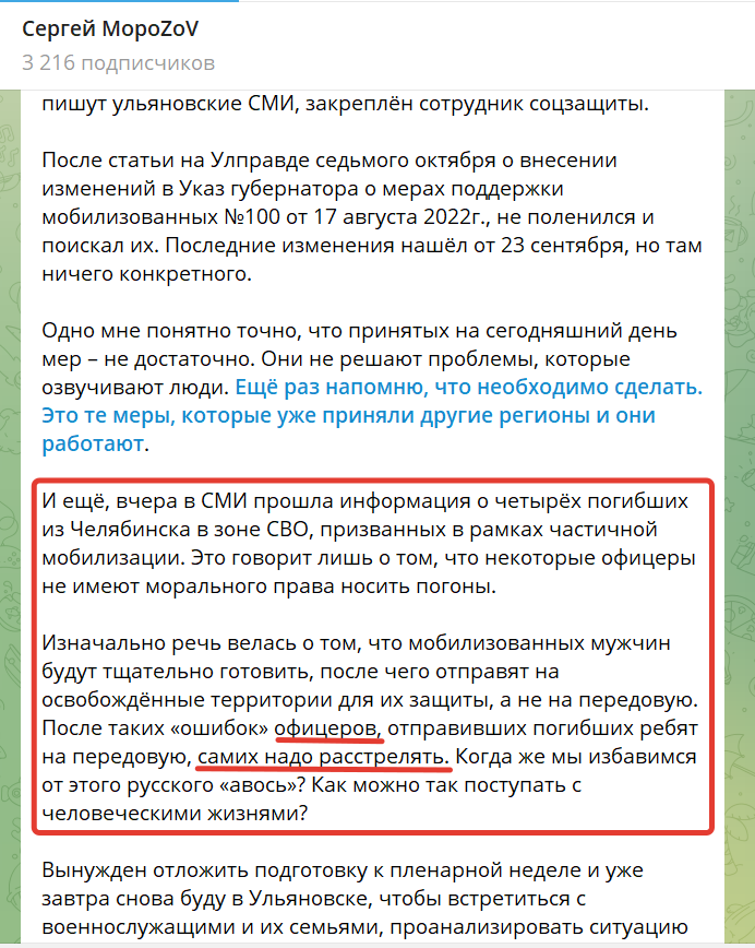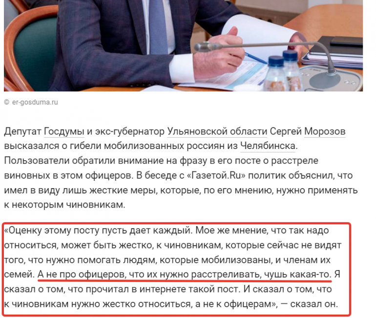 «Оценку этому посту пусть дает каждый. Мое же мнение, что так надо относиться, может быть жестко, к чиновникам, которые сейчас не видят того, что нужно помогать людям, которые мобилизованы, и членам их семей. А не про офицеров, что их нужно расстреливать, чушь какая-то. Я сказал о том, что прочитал в интернете такой пост. И сказал о том, что к чиновникам нужно жестко относиться, а не к офицерам», — цитирует издание ответ Морозова. В общем, дело плохо, и поэтому надо кого-то срочно расстрелять.