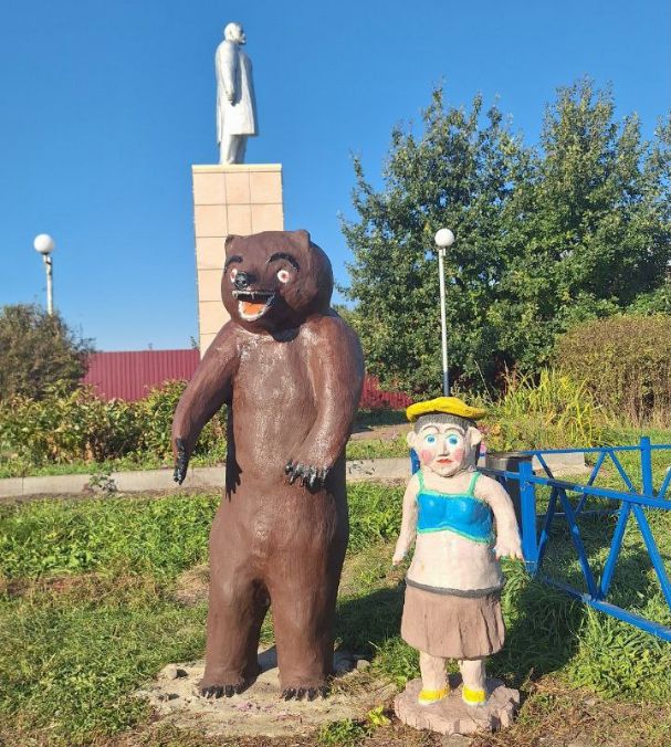 В Карсунском районе Ульяновской области на детской площадке села Вальдиватское установили скульптуру Маши и Медведя – героев популярного мультфильма. Однако эти персонажи мало похожи на мультяшных. Особенно смешно они выглядят на фоне памятника Ленину, который на заднем плане.