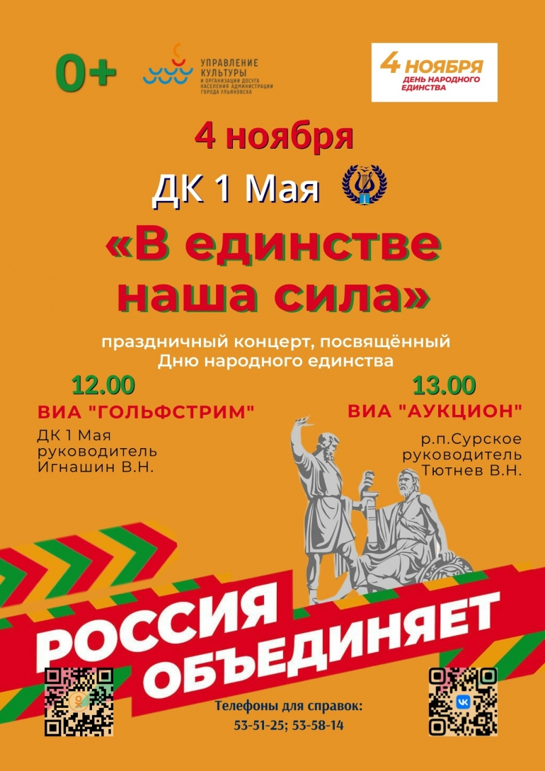 4 ноября в 12:00 в ДК 1 Мая (улица Академика Сахарова, 9/4) на праздничном концерте выступают ВИА «Гольфстрим» и ВИА «Аукцион».