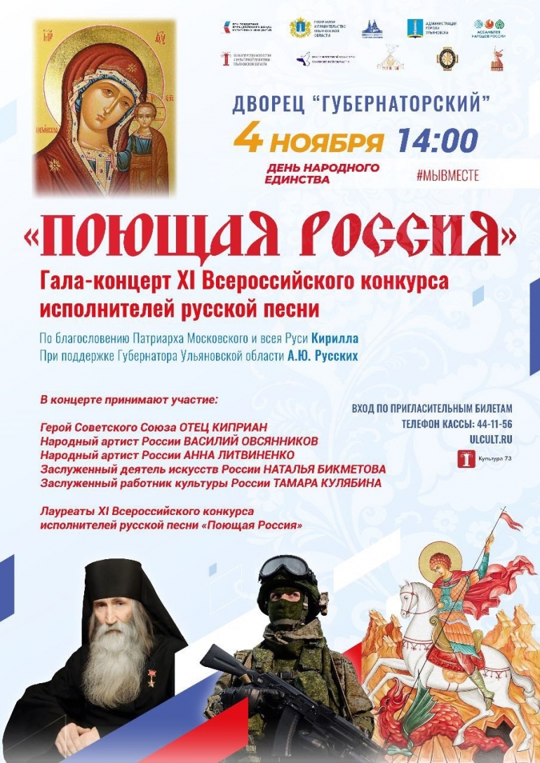 4 ноября в 14:00 во Дворце «Губернаторский» пройдет гала-концерт XI Всероссийского конкурса. Зрителей ждет мощь патриотических песен, нежность колыбельных, глубина духовных стихов и искренняя красота песен родного края. Вход на Гала-концерт – по пригласительным билетам.