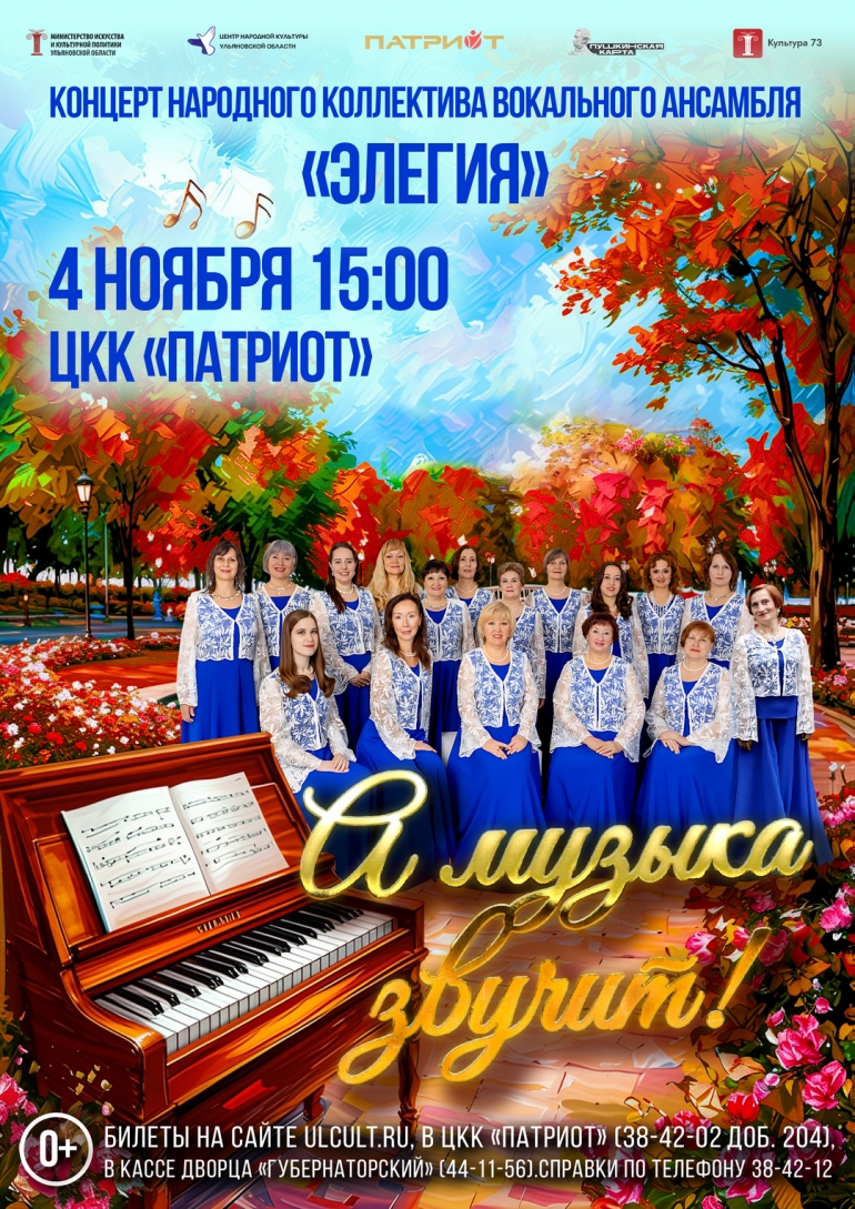 В 15:00 в ЦКК «Патриот» (пр. 50-летия ВЛКСМ, 15) состоится концерт «А музыка звучит!» народного коллектива вокального ансамбля «Элегия».