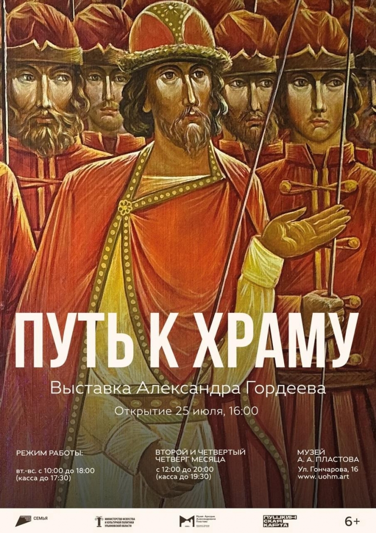В Музее Аркадия Пластова на выставке представлено свыше 60 живописных работ Александра Гордеева, отражающих его самобытный взгляд на мир и глубокую духовность. На выставке можно увидеть образцы и фотографии резьбы, выполненные для храма Богоявления в селе Прислониха, эскизы резьбы и архитектурных решений, а также фотографии из личного архива художника, раскрывающие историю его творческого пути и сотрудничества с семьей Пластовых.