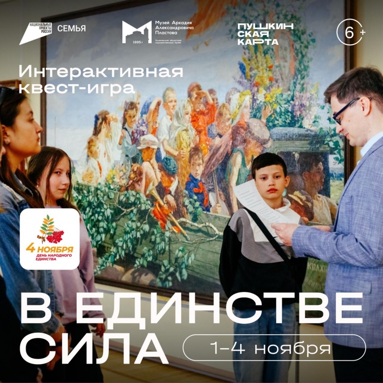 В Музее Аркадия Пластова проводится интерактивная квест-игра, где через призму творчества Пластова раскрываются истории праздников, сплетаются нити культур разных народов, демонстрируя, как много общего есть у людей, несмотря на различия. Задания квеста требуют не только наблюдательности, но и умения работать в команде, ведь истинное единство – в совместном поиске.Это путешествие, где каждый экспонат становится частью большой мозаики, раскрывающей мудрость и красоту мира, запечатленную кистью Аркадия Пластова. Квест проводится по предварительной записи с 10:00 до 17:30.
