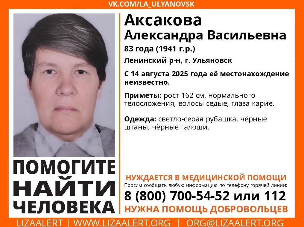 Вчера, 14 августа, в Ленинском районе Ульяновска пропала 83-летняя местная жительница Александра Аксакова. Женщина нуждается в медицинской помощи.