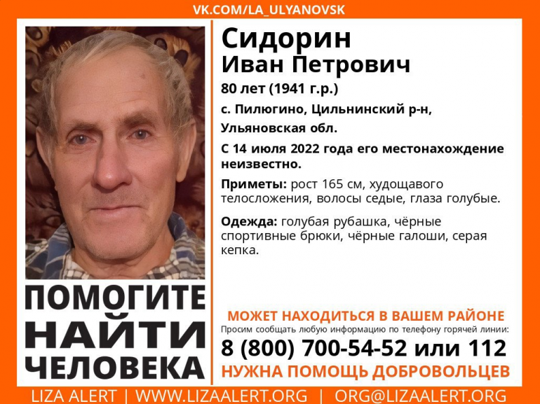 В Цильнинском районе Ульяновской области вчера, 14 июля, пропал 80-летний житель села Пилюгино Иван Петрович Сидорин.