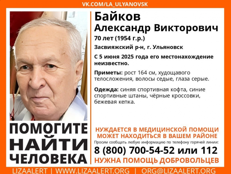 Вчера, 5 июня, в Засвияжском районе Ульяновска пропал 70-летний местный житель Александр Байков. Мужчина нуждается в медицинской помощи.