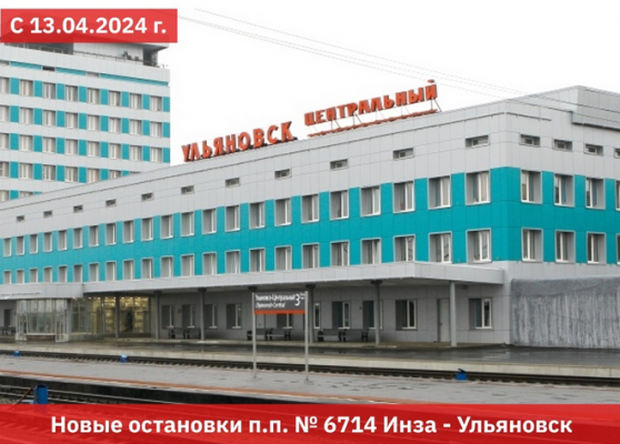 Пригородному поезду №6714 сообщением «Инза – Ульяновск» с завтрашнего дня, 13 апреля, назначаются новые остановки, сообщает Башкортостанская ППК.