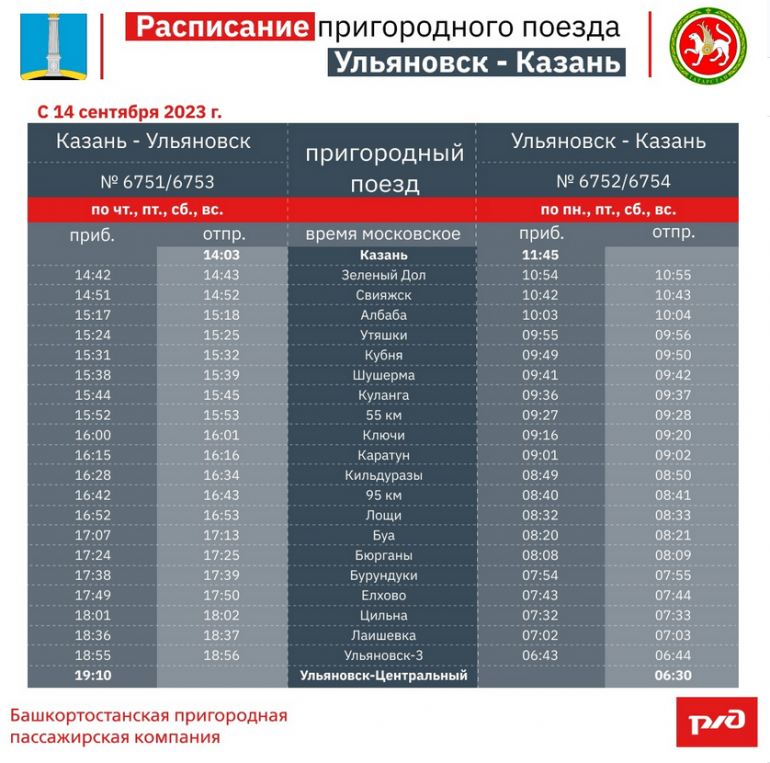 Башкортостанская пригородная пассажирская компания сообщает, что с 14 сентября вносятся изменения в периодичность курсирования пригородных поездов из Ульяновска в Казань.
