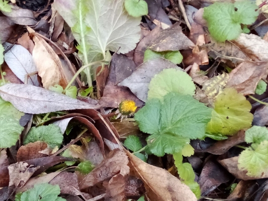 На фото отчетливо видно, что среди облетевшей листвы желтеют головки одуванчиков.