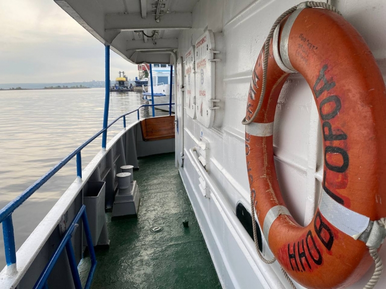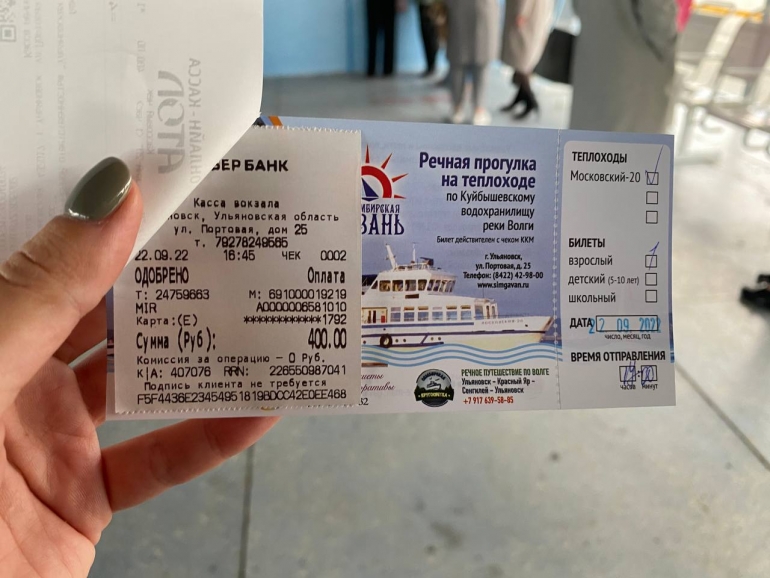 Маршрут путешествия — до УлГТУ, немного не доплыли до Президентского моста. На палубе молодой мужчина разговаривает по телефону и обсуждает мобилизацию: «Прислали повестку, велели явиться в военкомат».