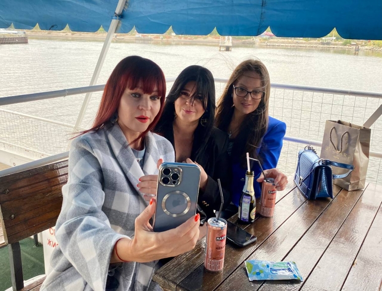 На теплоходе работал фотограф. Девушки поинтересовались, стоит ли им имитировать селфи для снимка, и принялись позировать.