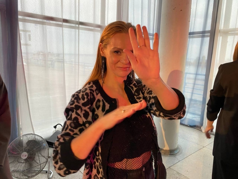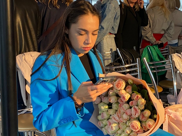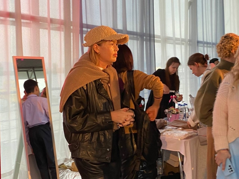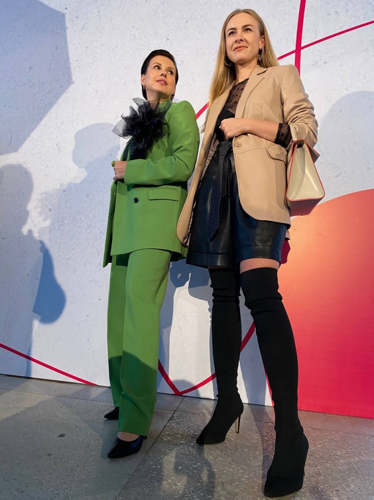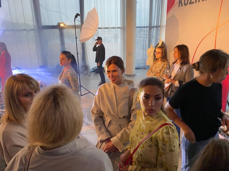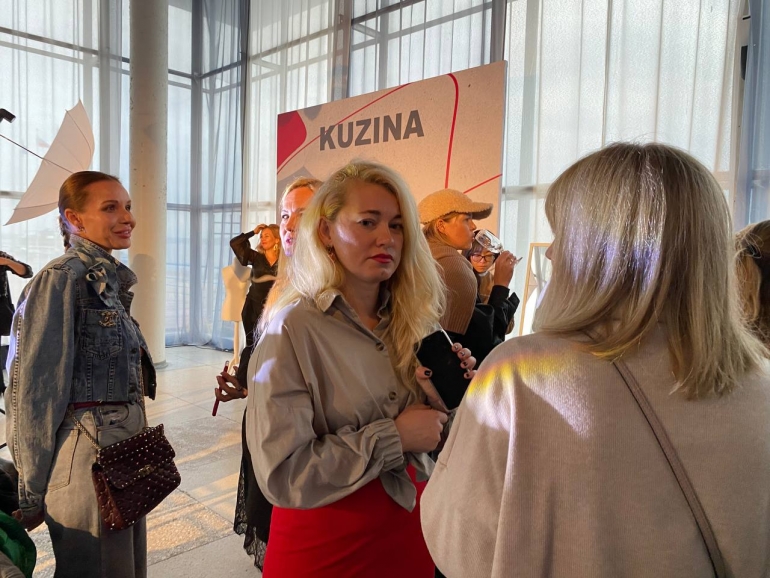 Почетный гость — бизнес-омбудсмен Екатерина Толчина — для мероприятия выбрала романтичное платье с цветочным принтом. Пожелала удачи проекту Kuzina и подарила Ирине Маловой букет. Сама модельер появилась в темно-синем пальто собственного производства.