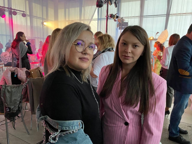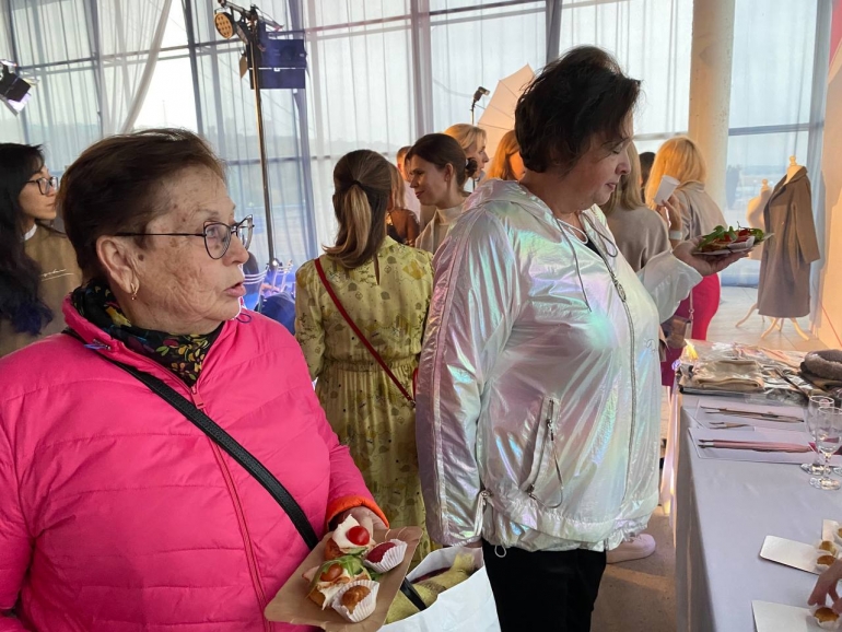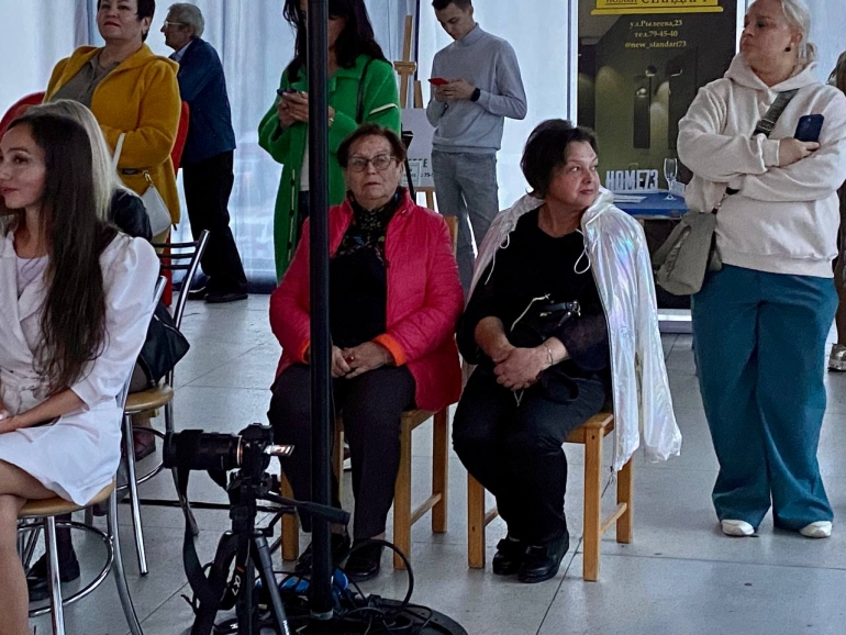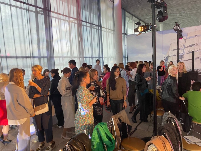 На мероприятии оказались и заблудшие женщины с теплохода — сначала у фуршетного стола, а затем и на самом показе. Гостий отсадили подальше на табуретки, но их это ничуть не смутило. Кстати, дамы ничем особо не отличались от других приглашённых - со старательными укладками и ярким маникюром. Настоящие стильные штучки!