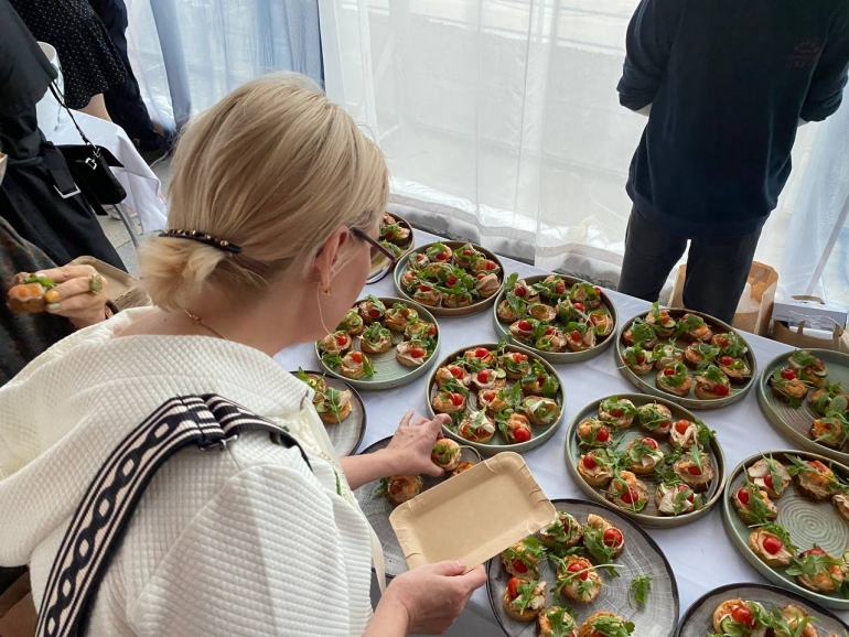 Люди приехали голодными, особенно после речной прогулки, так что закуски расходились быстро. Кейтеринг пестрил разнообразием: сыры, фрукты, канапе, брускетты с креветками, мясом, рыбой. К шампанскому подавали профитроли ручной работы. Еду предоставили рестораны «Берлускони» и винный бар «Правда», а также компании «Сыры Глебовой» и «Суши Бокс».
