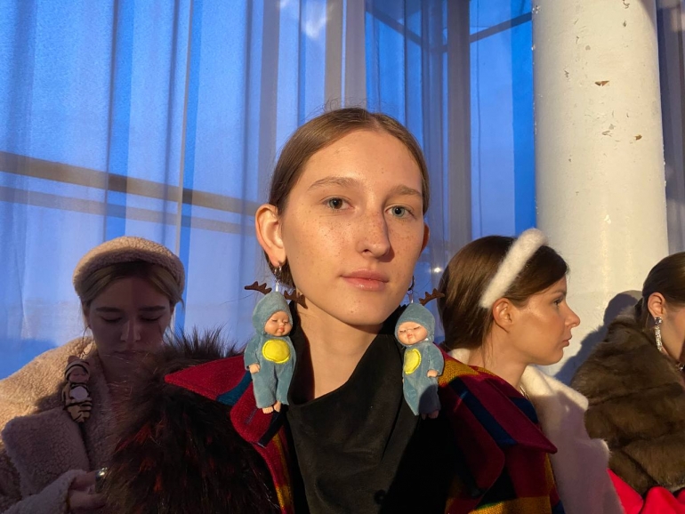 Бренд «Снежка» добавил образам ярких и массивных, иногда неожиданных аксессуаров. О советском прошлом намекали осовремененные ушанки и меховые кокошники.