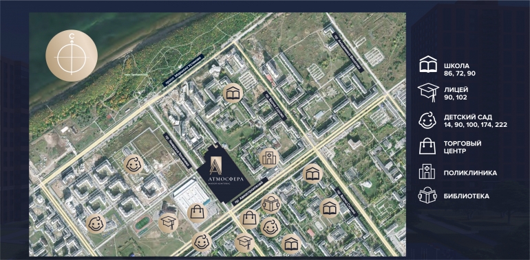 ЖК "Атмосфера" - это шесть 16-24 этажных высоток, расположенных в одной из лучших и комфортных локаций Нового города - на проспекте Генерала Тюленева. Он проходит через микрорайон, охватывая самые необходимые для жизни объекты, в том числе социальные. Улица пересекает одну из центральных артерий - проспект Ленинского Комсомола и ведет к проспекту Созидателей на окраине микрорайона, поэтому с транспортной доступностью проблем точно не будет.