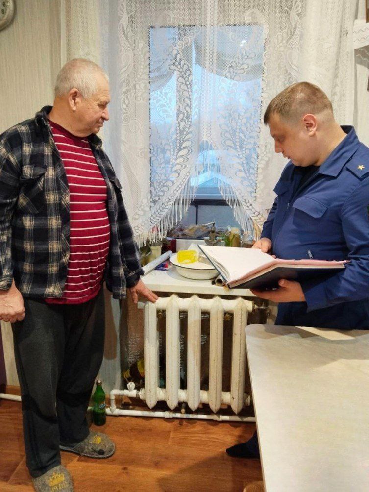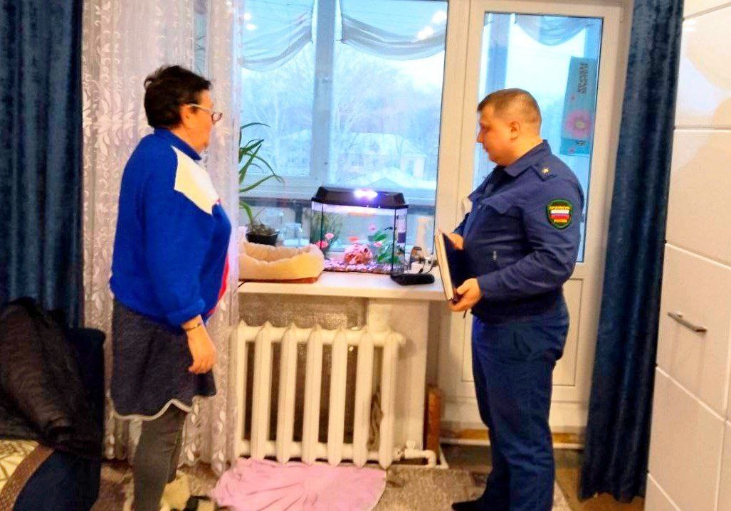 Старший помощник прокурора Ульяновского района района Антон Шаляхин вместе со специалистами Корпорация развития коммунального комплекса Ульяновской области во время поквартирного обхода замеряет температуру в системах отопления жилых помещений в многоквартирных домах и опрашивает жителей села.
