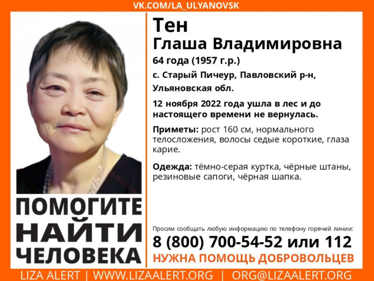 Волонтеры из поисково-спасательного отряда «Лиза Алерт» сообщают, что в Ульяновской области пропала 64-летняя жительница села Старый Пичеур Павловского района Глаша Тен.
