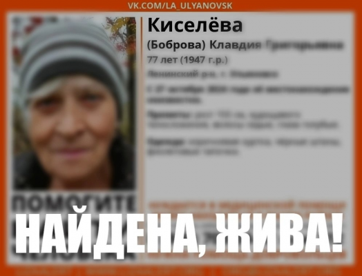 Напомним, 27 октября в Ленинском районе Ульяновска пропала 77-летняя местная жительница. Вчера, 31 октября её нашли.
