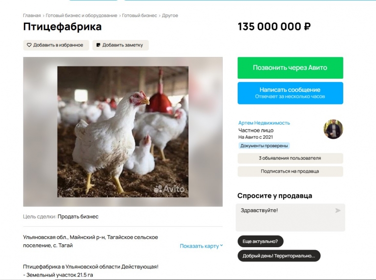 К слову, в сентябре этого года птицефабрика снова оказалась выставлена на продажу. В объявлении на Авито говорится, что предприятие действующее, в стоимость входят цеха, земля и оборудование. Бизнес оценили в 135 млн руб. Выкупил птицефабрику несколько лет назад, очевидно, у банка, учредитель ООО «Экоптица» Аскер Мурадалиев. За 2024 год компания показала выручку в 2,6 млн руб. и прибыль в 323 тыс. руб. (данные «Коммерсант.Картотеки»).