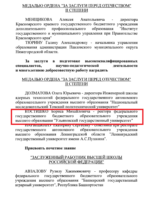 Медалью Ордена «За заслуги перед Отечеством» II степени ректора Ульяновского госуниверситета Бориса Костишко президент наградил за заслуги в подготовке высококвалифицированных специалистов, научно-педагогической деятельности и многолетнюю добросовестную работу.