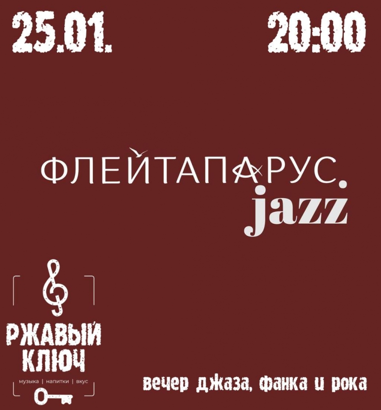 Музыкальная феерия ожидает гостей в баре «Ржавый ключ»: известные джазовые композиции прозвучат в неординарной интерпретации. Приготовьтесь к взрывному коктейлю из джаза, фанка и рока, который представят талантливые исполнители: Роман Петяк (гитара), Rai To (ударные), Артемий Губенко (бас-гитара), и Ирина Лунина, известная как Флейтапарус (вокал).
