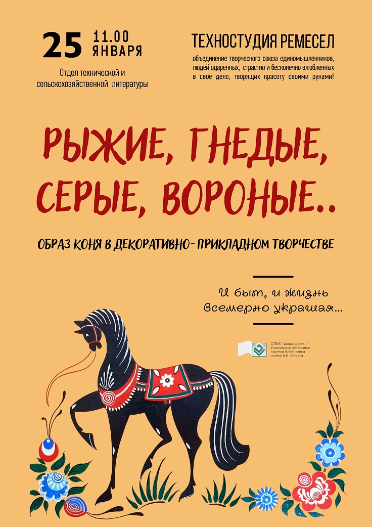 На январском занятии «Техностудии ремёсел» рукодельницы узнают, как представлен образ коня в прикладном искусстве народов России: в росписи, объёмной резьбе, керамической игрушке, художественном металле, народной вышивке. Фигурка коника являлась одной из первых обязательных детских атрибутов и всё время сопровождала ребёнка. А девушки использовали шумящие привески — «рясны» с двухголовым конём для отпугивания злых духов и приманивания добрых.