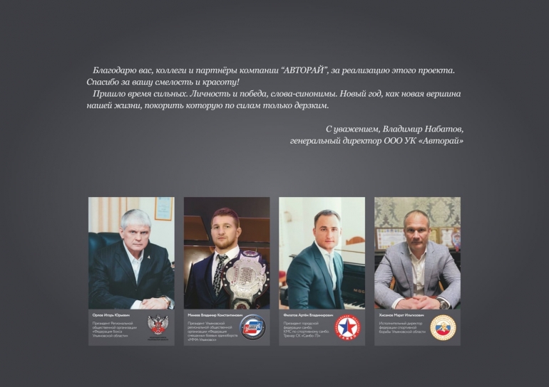 Подготовка календаря проходила при участии авторитетных спортсменов, которые выступили партнерами организатора съемок: руководителей федераций бокса Игоря Орлова, смешанных боевых единоборств Владимира Минеева, спортивного самбо Артема Филатова, исполнительного директора федерации спортивной борьбы Марата Хисамова.