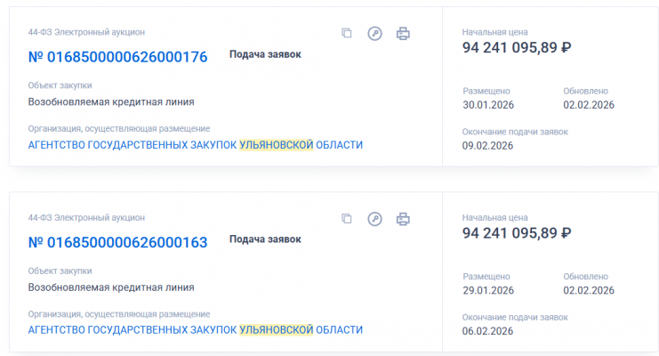 На портале ЕИС «Закупки» появилось две заявки на открытие возобновляемой кредитной линии, заемщиком выступает Министерство финансов Ульяновской области. Кредиторы могут поучаствовать в электронном аукционе до 9 февраля.