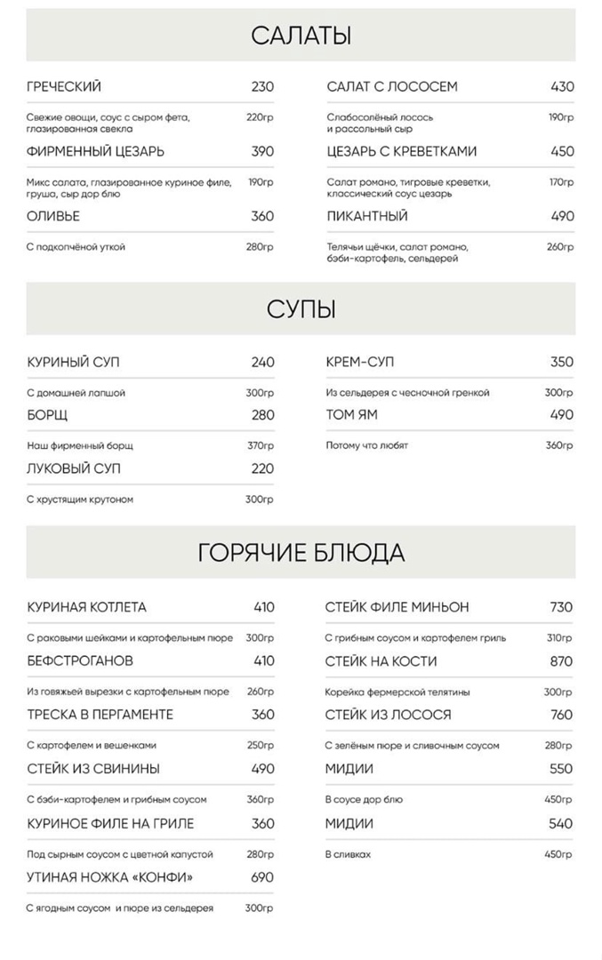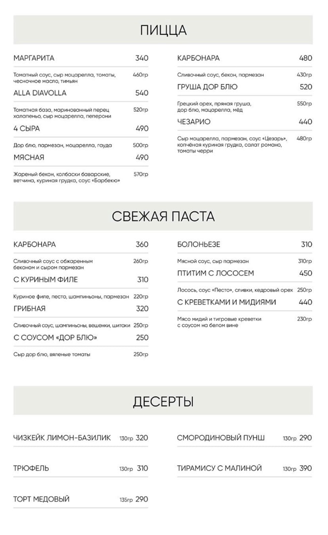 Меню заведения ориентировано на итальянскую кухню, а значит, в нем вы увидите различные варианты пасты и пиццы, а вот устриц уже нет, зато есть северные креветки. Помимо итальянских блюд, в меню присутствуют том-ям, борщ и котлеты.