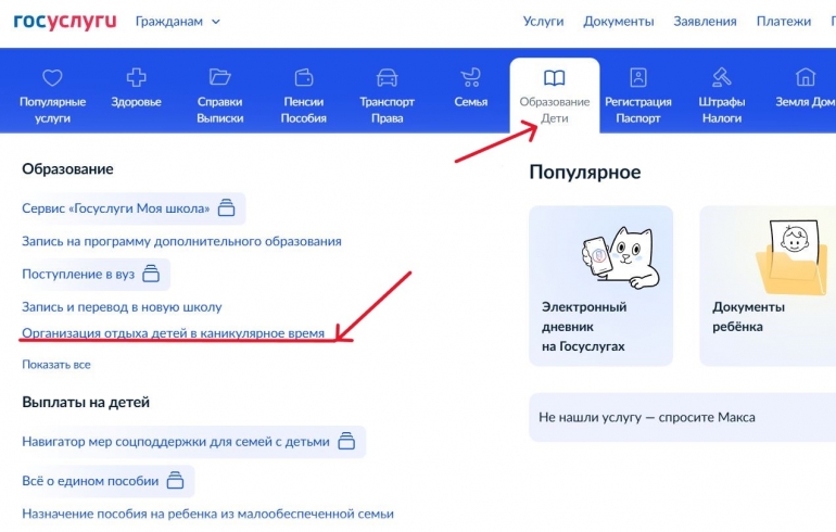 Оформление заявок на приобретение путёвок за частичную стоимость будет осуществляться родителями через личный кабинет на портале «Госуслуг». Для этого необходимо перейти в раздел «Образование дети», подраздел «Организация отдыха детей в каникулярное время».