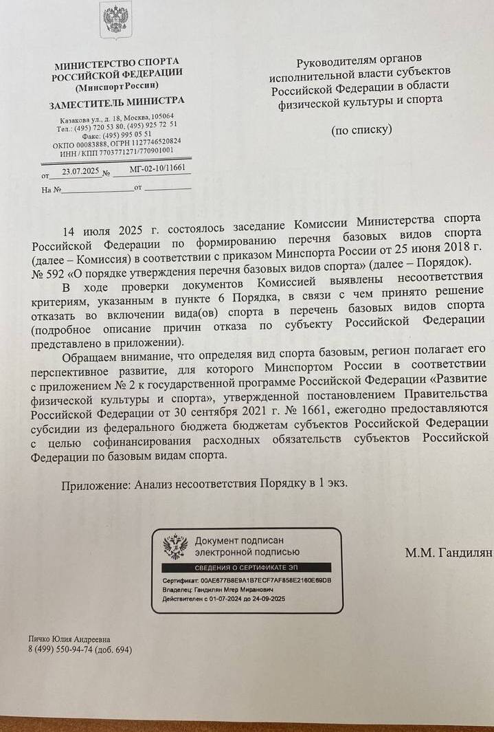 В документе, подписанном замминистра Мгером Гандиляном, говорится о том, что в ходе проверки документов, предоставленных Минспорта Ульяновской области, выявлены несоответствия критериям, позволяющие федерациям по видам спорта иметь статус базовых. В итоге впервые с 2016 года решено исключить все ульяновские федерации из списка базовых.