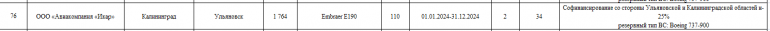 Согласно документу, из Калининграда можно будет летать по льготным ценам в Ульяновск с 1 января по 31 декабря 2024 года на воздушном судне Embraer E190 (резервный тип ВС: Boeing 737-900).