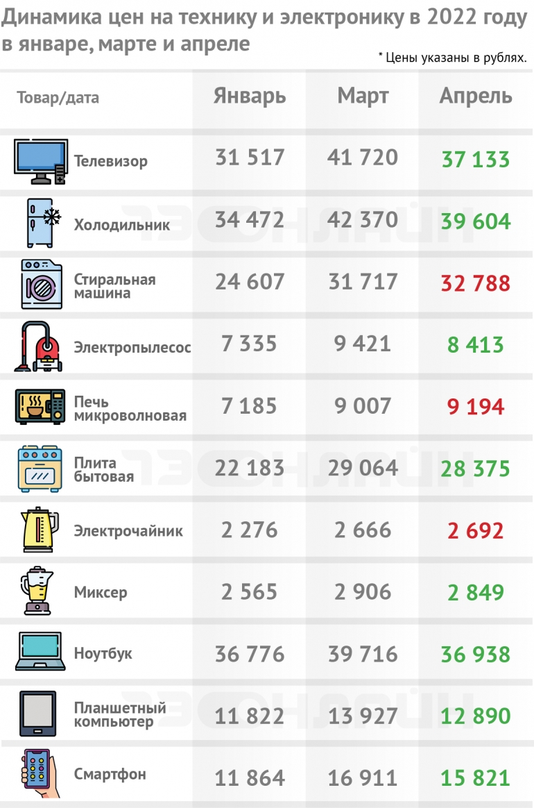Динамика цен на бытовую технику и электронику хорошо видна в приведенной ниже таблице, составленной по данным регионального управления службы федеральной статистики. В ней приведены данные по средней стоимости в Ульяновской области телевизоров, холодильников, стиральных машин, пылесосов, бытовых плит, электрочайников, миксеров, ноутбуков, смартфонов и планшетов.
