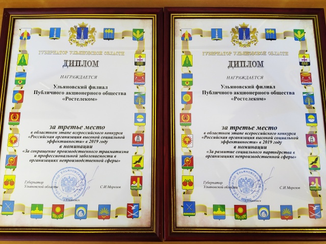 Ульяновский филиал компании «Ростелеком» успешно выступил в областном этапе всероссийского конкурса «Российская организация высокой социальной эффективности» – занял третьи места в номинациях «За развитие социального партнерства в организациях непроизводственной сферы» и «За сокращение производственного травматизма и профессиональной заболеваемости в организациях непроизводственной сферы».