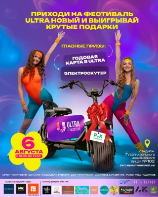 - РОЗЫГРЫШ ГЛАВНЫХ ПРИЗОВ — ЭЛЕКТРОСКУТЕРА «Скиба Ультра» за 140 000 ₽ и годовой клубной карты в ULTRA! И много подарков от ULTRA-партнёров фестиваля!