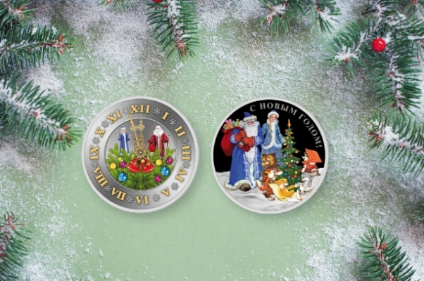 Эти монеты, выполненные из серебра, привлекают внимание оригинальным дизайном. На них изображены любимые всеми Дед Мороз и Снегурочка, которые спешат поздравить всех с праздником, а также часы, которые вот-вот пробьют двенадцать. К каждой монете прилагается сертификат подлинности и элегантная упаковка, что делает этот подарок особенно привлекательным.