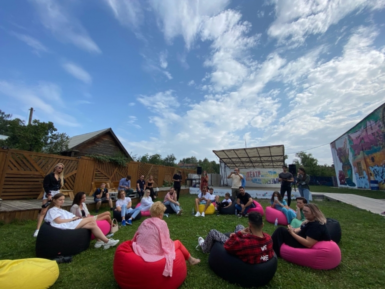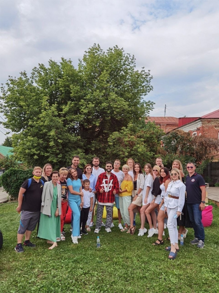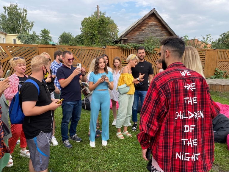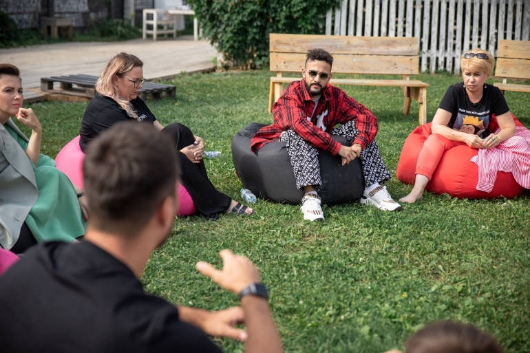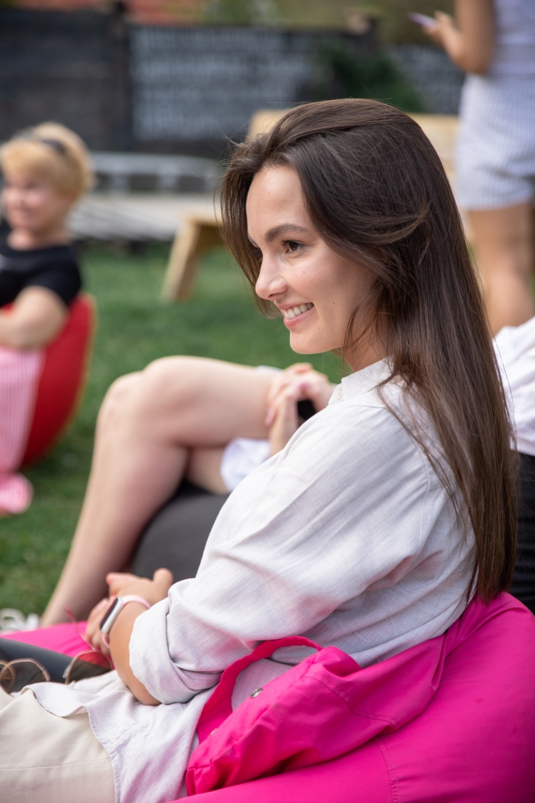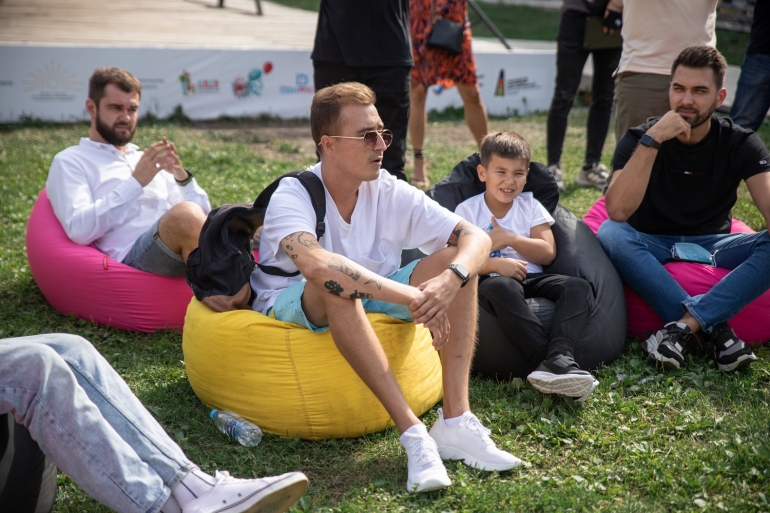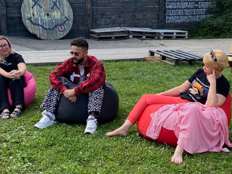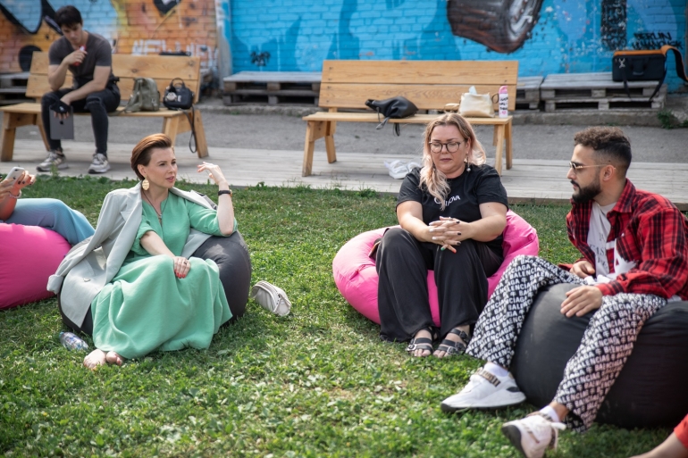 Было решено, что разговор будет проходить на свежем воздухе. Прямо на солнышке... И на траве. Поэтому дамы были вынуждены снять свои лодочки и остаться босиком. Впрочем, никого это не смутило. Гасанов попросил всех подсесть поближе, а от микрофона отказался. Можно сказать, что атмосфера была домашняя.