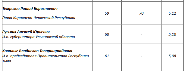 Напомним, Алексей Русских был назначен исполнять обязанности главы нашего региона 8 апреля. По итогам этого неполного месяца он попал в число губернаторов со средним влиянием. Его балл по расчётам АПЭК составил 5,1.