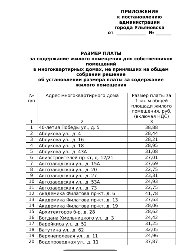 Так, размер платы за 1 кв. м. жилой площади, включая НДС, повысится до 19,98 — 43,25 рублей. С тарифами и перечнем адресов можно ознакомиться в приложении к постановлению.