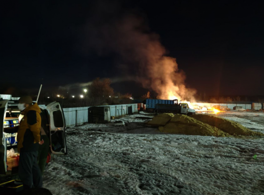 - Происходит горение 4 тонн на 100 квадратных метрах технического магния на открытой местности в мешках. Существует угроза перехода огня на бочки с маслом (4 т.). Площадь хранения 40 кв.м. Осуществляется обсыпка песком для недопущения перехода огня.