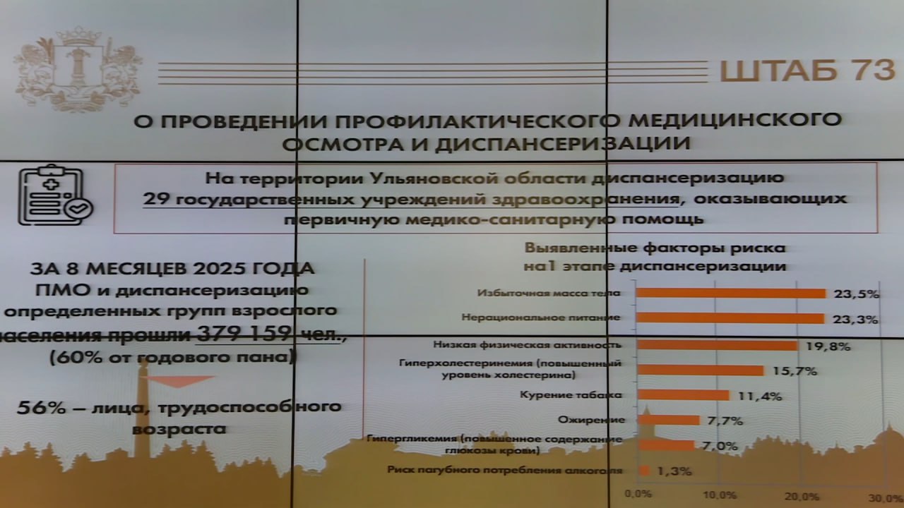 Такие цифры озвучил на заседании штаба по комплексному развитию Ульяновской области заместитель министра здравоохранения региона Михаил Логинов. Он отметил, что план по диспансеризации выполнен на 60%.